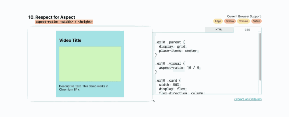使用纵横比属性,当我调整卡片大小时,绿色视觉块保持 16 x 9 纵横比。我们通过纵横比维持这个纵横比:16 / 9。